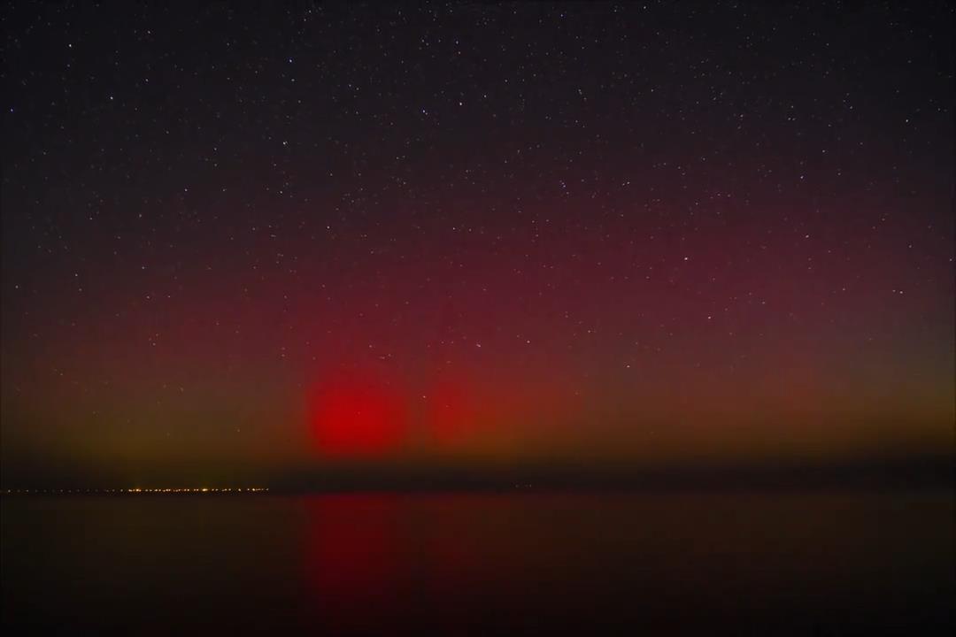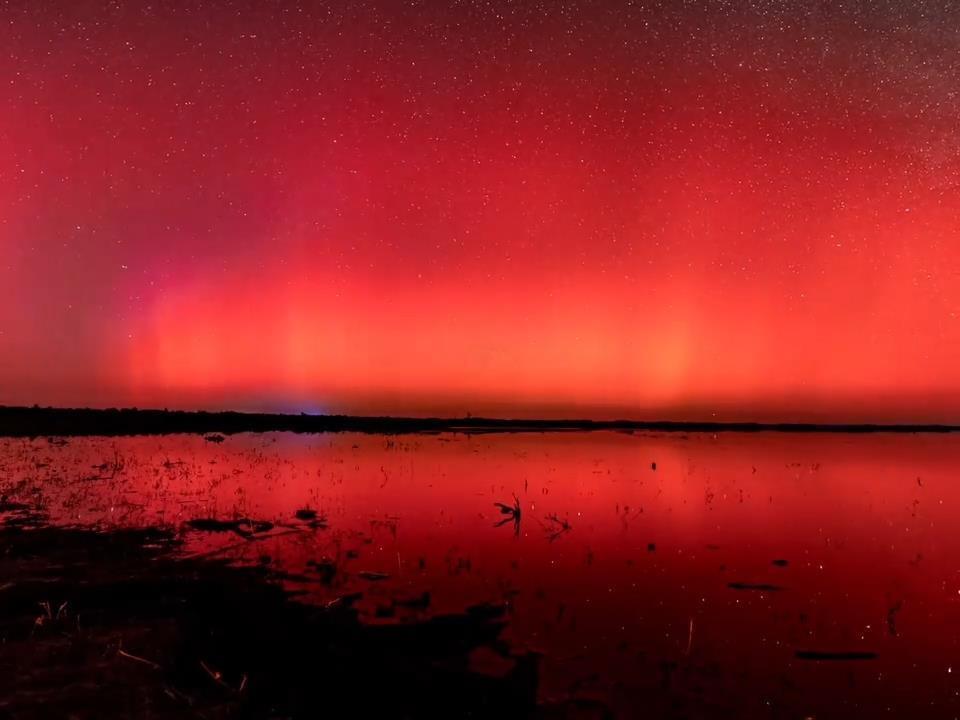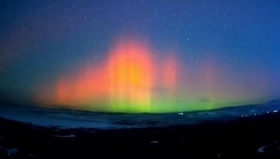 视频画面显示,在黑龙江省鹤岗市鹤立湖、大庆市郊区、哈尔滨市泥河水库和大兴安岭地区加格达奇区等多地夜空中出现了绚丽的红色极光;在内蒙古自治区呼伦贝尔市额尔古纳,天空中的极光在靠近地面的区域显示为绿色,远离地面的区域却是橘红色,从远处看仿佛一条红绿渐变的丝带飘浮在夜空中;新疆乌鲁木齐郊区的极光颜色则是更为纯粹的红色,极光倒映在水中将天地都染成了红色。