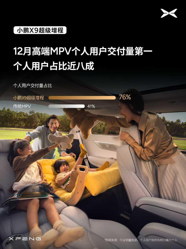 小鹏X9超级增程将个人用户交付比例放在第一维度。数据显示,12月高端MPV市场,小鹏X9超级增程个人用户交付占比达到76%,而传统MPV车型仅为41%。